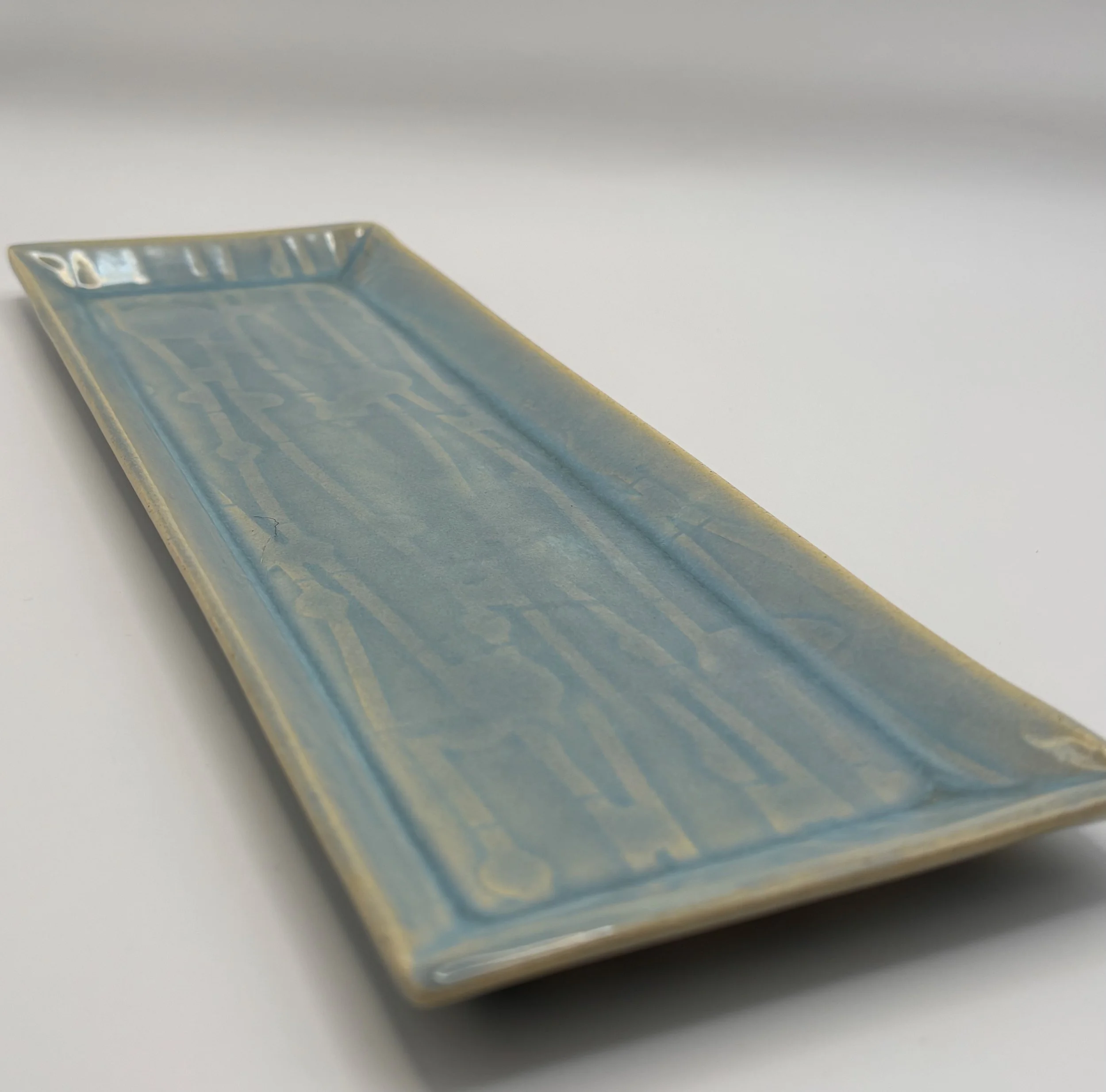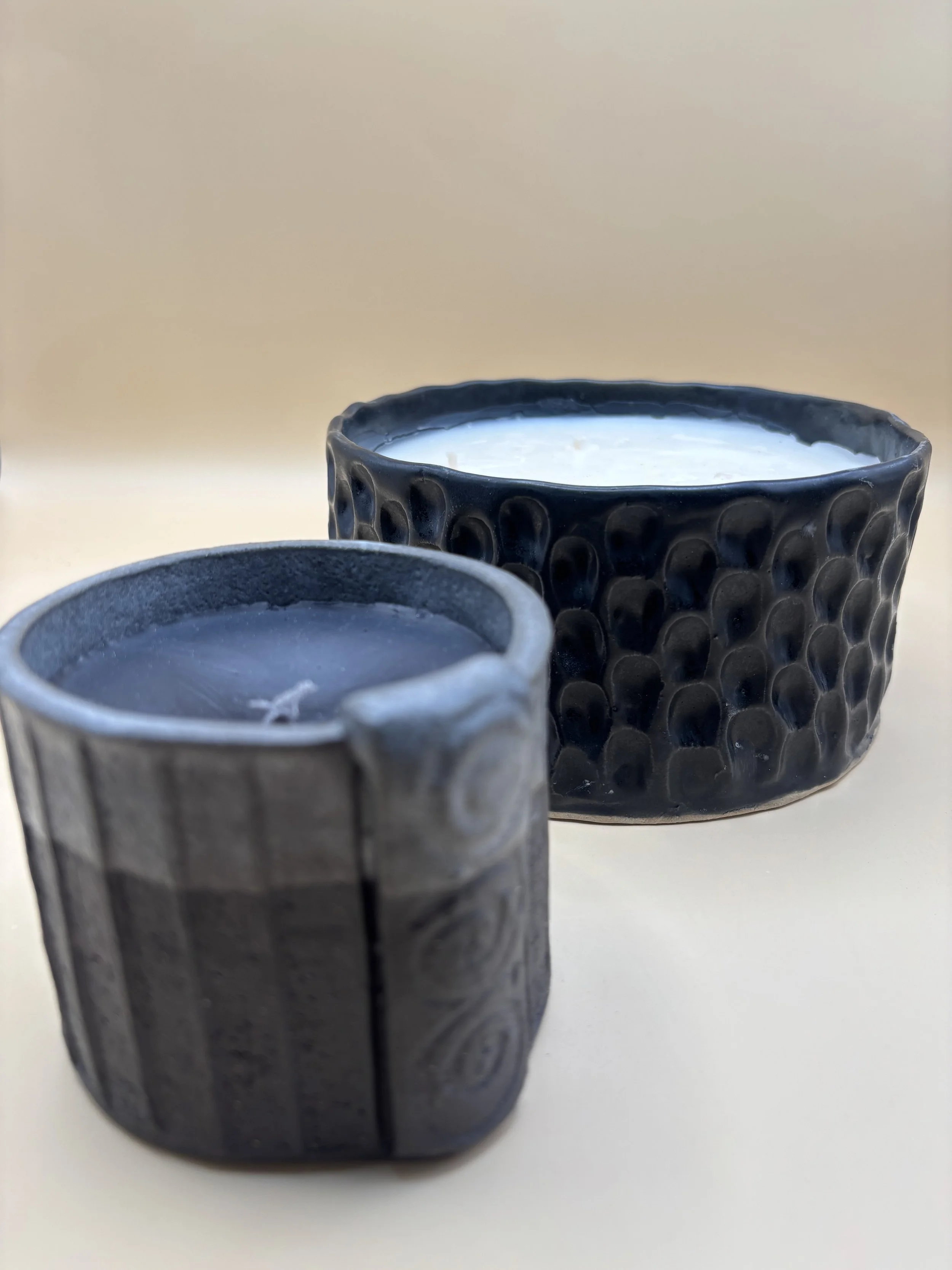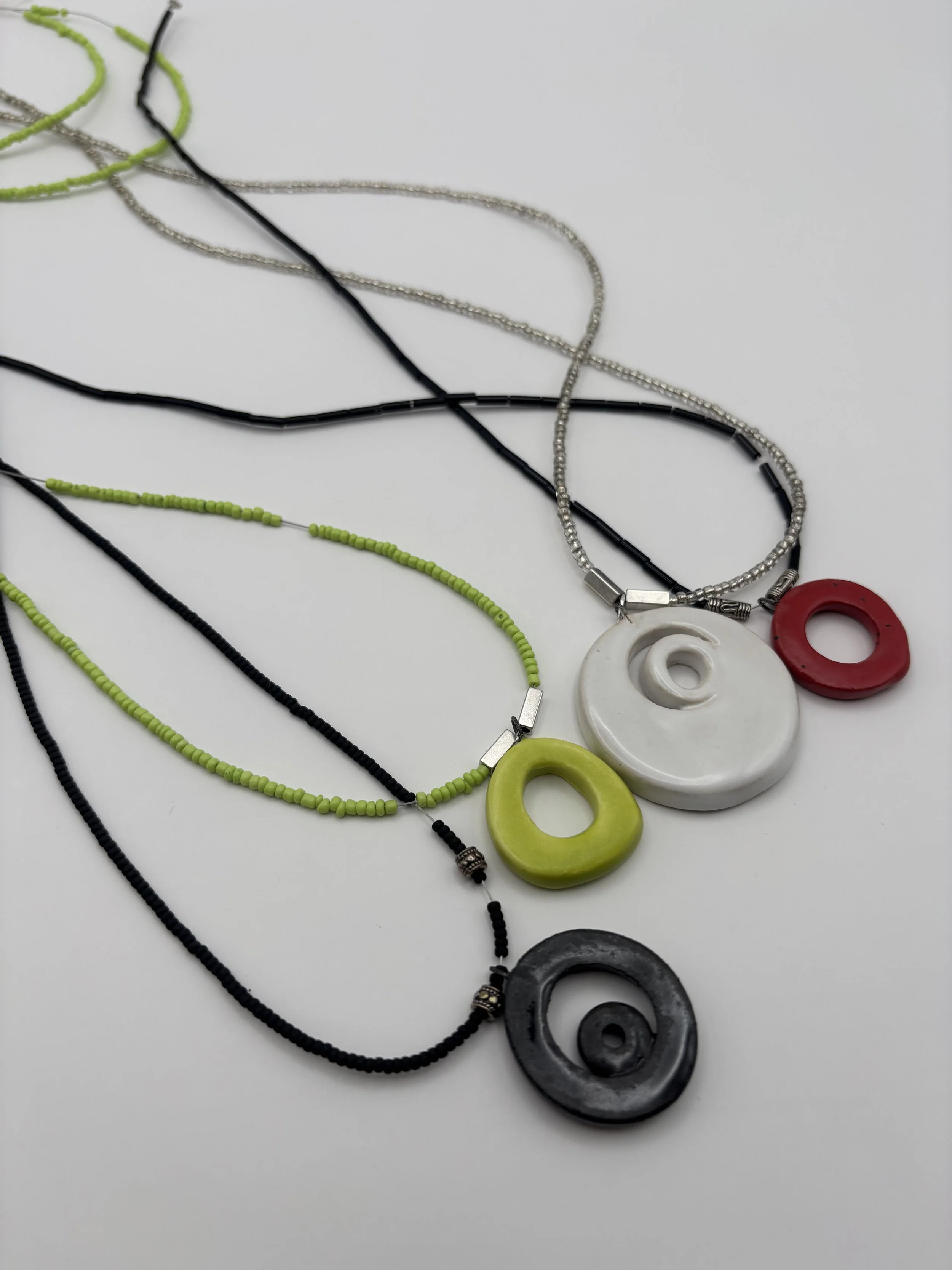 The pottery I make is handbuilt either from a slab or coil methods. My work is focused on making functional pieces like candles, platters and vases. Recently, I started experimenting with making pendants and have been hanging them on beaded necklaces. I explore different clays and glazes, using texture to bring interest.